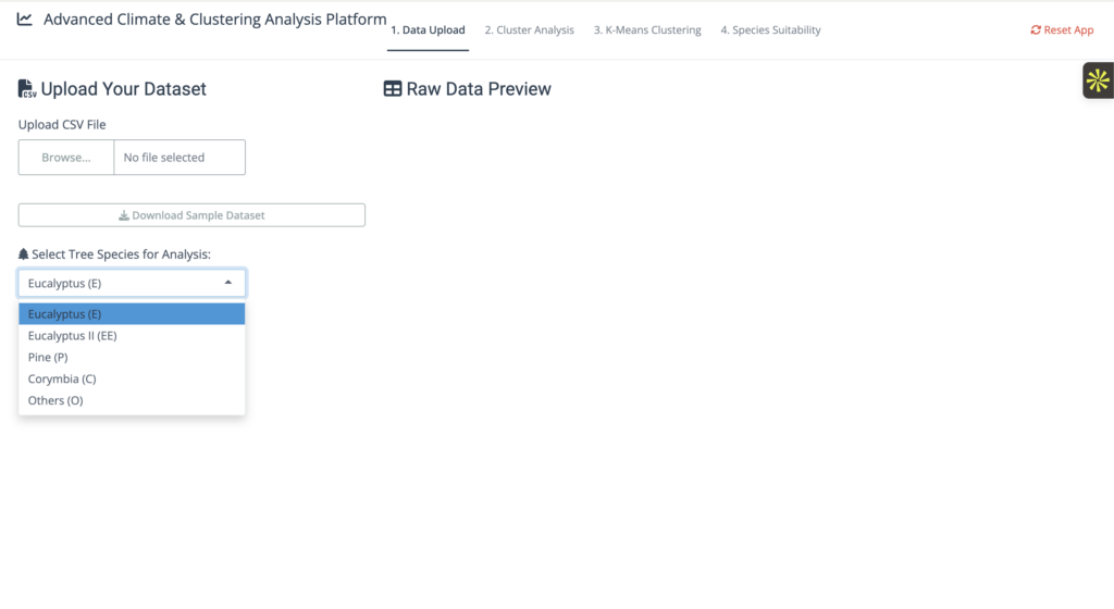 • Select your target tree species from the dropdown menu (Eucalyptus, Eucalyptus II, Pine, Corymbia, or Others)